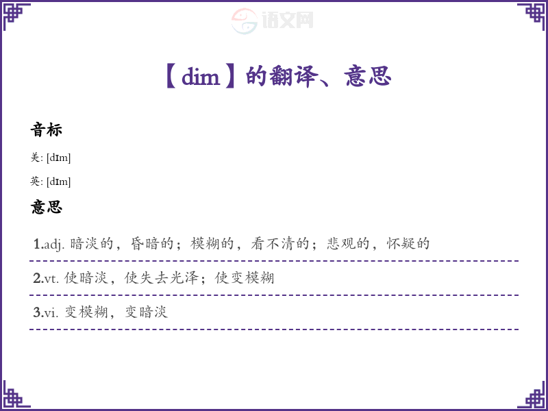 /dɪm/ 的发音与“沉闷”相似,可以联想为“昏暗的感觉”。 -