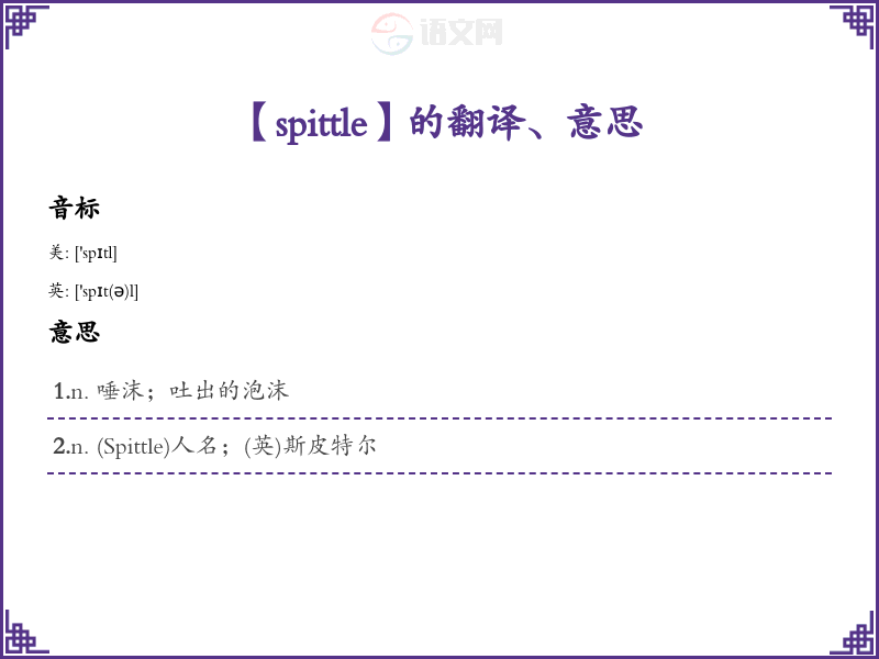 - 谐音联想记忆:可以将spittle与“喷出的唾液”联系起来,想象当你在说话时,唾液喷出,形成“spittle”。这个词的发音“spit”与“喷”相似,帮助记忆。