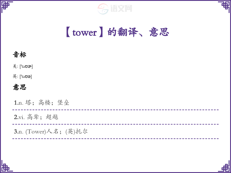 - 词性:名词(noun),也可以作为动词(verb)使用,意指高耸或建造塔。