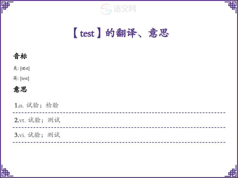 - 字面意思:"Test"字面意思是对某事物的检验或评估,通常用于测量知识、技能或能力。