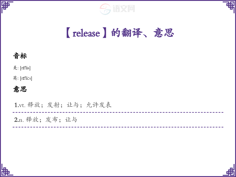 “Release”源自拉丁语“relaxare”,意为“放松”。由前缀“re-”(表示回、再)和词根“lease”(意为“放松或允许”)组成。 -
