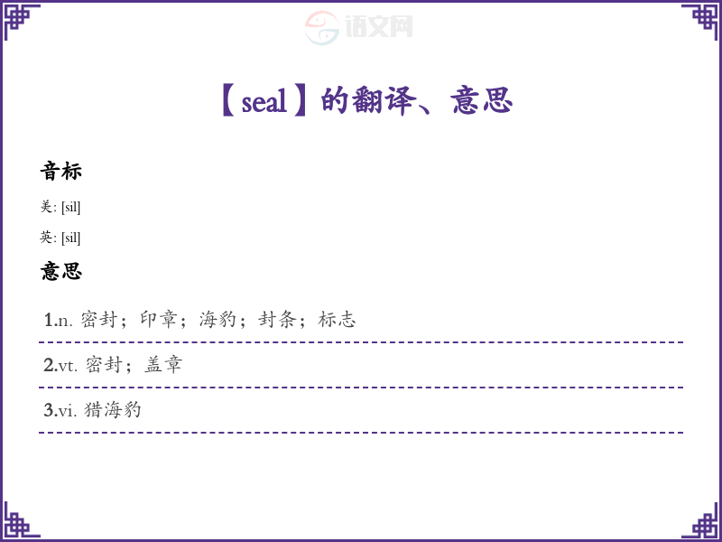 - 在**的英语教材中,seal可能出现在小学或初中的自然科学或动物相关单元。在牛津和美国的教材中,seal常见于初中和高中英语课本的阅读理解部分,涉及动物、环保等主题。