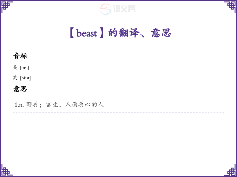 - 通过了解“beast”的词源“bestia”,可以将其与其他拉丁词汇联系起来,比如“bestial”(野兽般的,残忍的),帮助加深记忆。