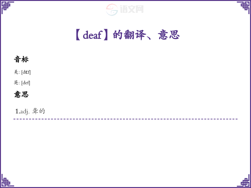 - “deaf”的音标为 /dɛf/。可以通过发音练*将其与“death”(死亡)相联系,帮助记忆。注意发音时嘴型的变化,并结合手势加深印象。