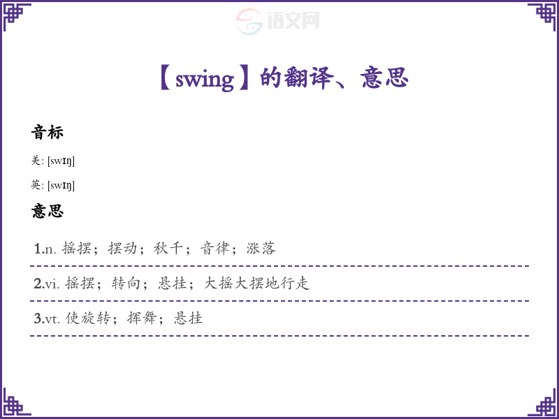 - “swing” 的音标是 /swɪŋ/。可以通过将音标与“摇摆”的动作相结合,想象一个人在秋千上摆动,来帮助记忆。