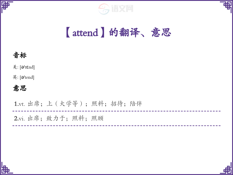 - 字面意思:字面上,"attend"意味着“出席”或“参加”,也可以指“注意”或“关注”。