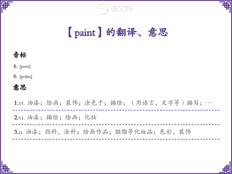 - 动词:指涂抹或应用颜料,如“to paint a picture”(画一幅画)。