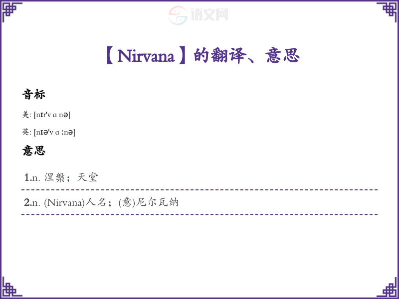音标记忆法:Nirvana的音标是/nɪrˈvɑː.nə/。可以通过分音节来记忆,强调第二音节“vā”,联想到“胜利”与“涅槃”的关系。