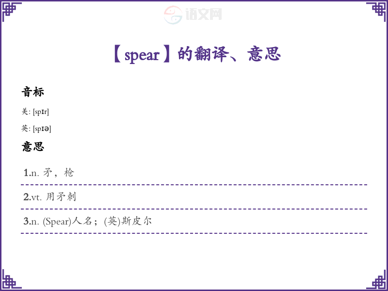 - 记忆方法:将“spear”发音分为/s/(声母)+ /pɪr/(韵母),可以想象一根尖锐的长矛发出“嘶”的声音,帮助记忆。