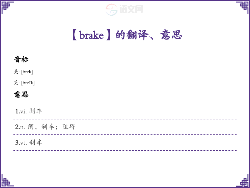 - 音标记忆法:将“brake”发音为/breɪk/,可以联想为“break”来记忆。