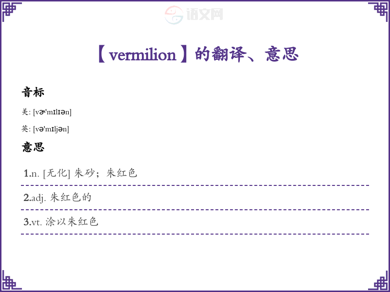 - 字面意思:Vermilion 是一种鲜艳的红色,通常指代一种用于绘画和染色的颜料。