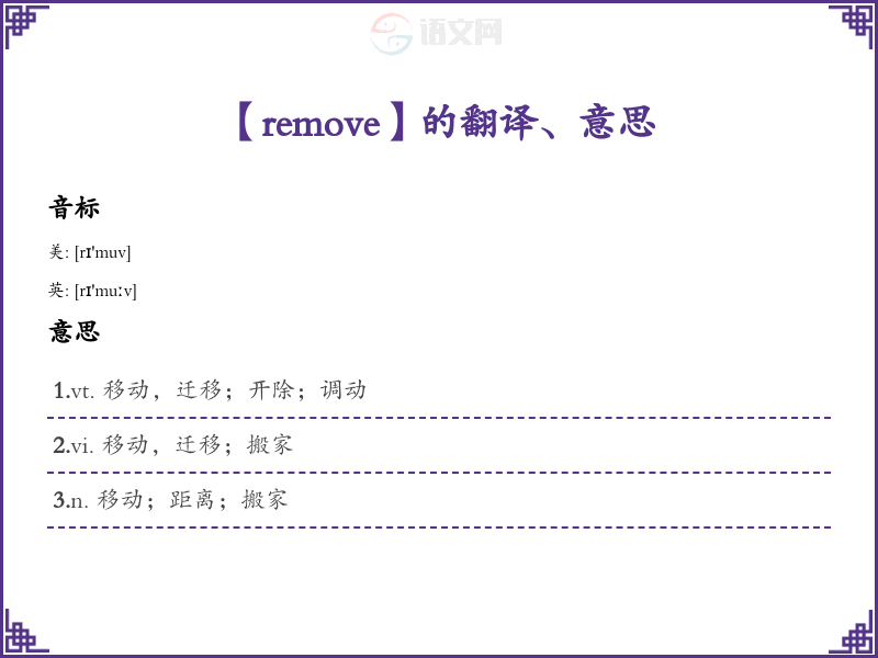 - 字面意思: "remove" 的字面意思为“去除”或“移走”。定义为将某物从一个位置转移到另一个位置,或从某个状态中消除。