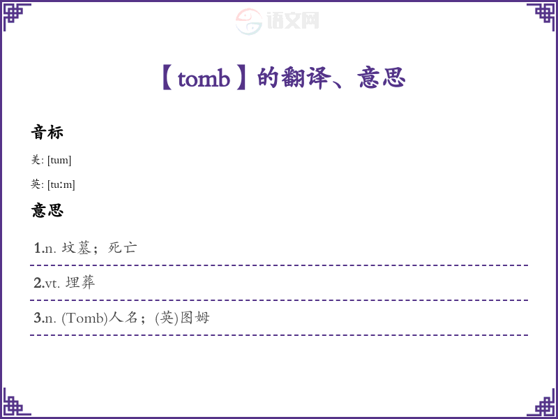 词源分析:Tomb源自古法语“tombe”,而古法语又源自拉丁语“tumba”,最终可以追溯到希腊语“τύμβος”(túmbos),意为“坟墓”或“埋葬之地”。