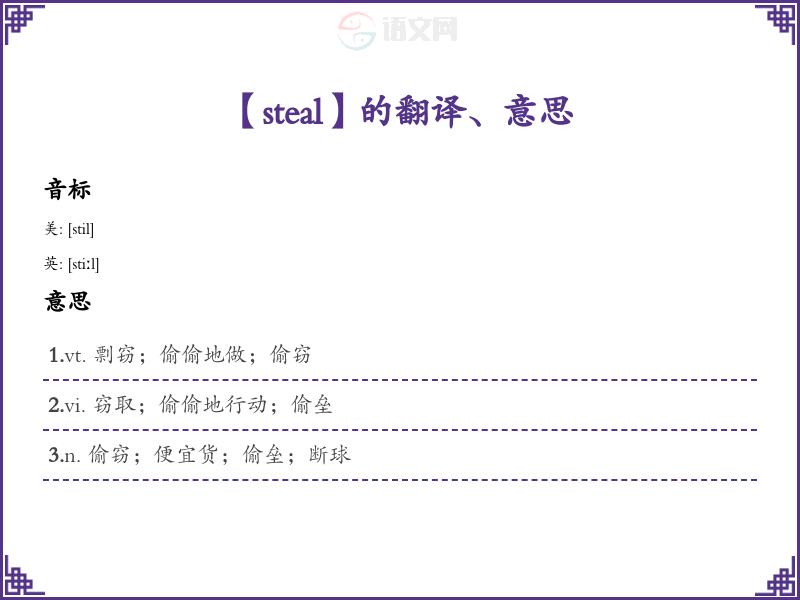 字面意思:Steal的字面意思是“偷偷地拿走某物,通常是未经允许的”。
