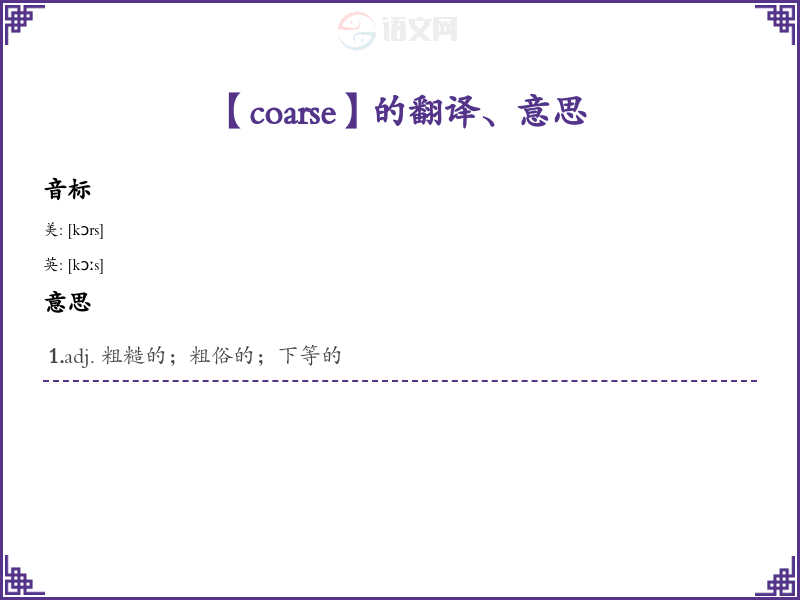- 音标记忆法:将“coarse”的发音 /kɔːrs/ 与“course”(课程)做联想记忆,想象一个粗糙的课程内容。