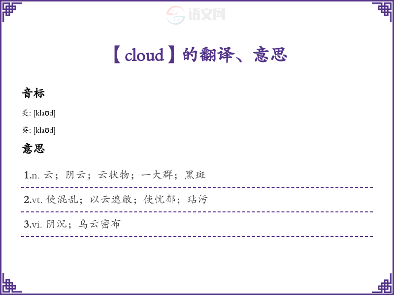 以上是关于“cloud”这个单词的详细分析与学*方法,希望能帮助你更好地理解和使用它。