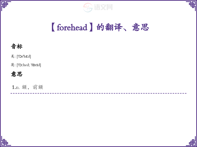 - 词源分析:forehead由两个部分组成:“fore”意为“前面”,而“head”指“头部”。因此,字面意思就是“头的前面”。
