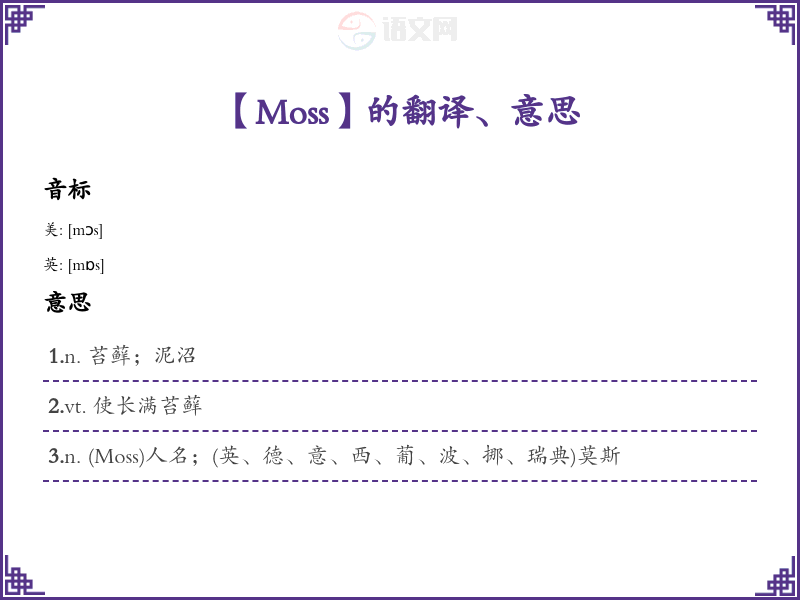 - 谐音联想记忆:可以将“moss”联想为“摸死”,想象在潮湿的环境中摸到软乎乎的苔藓,帮助记忆这个字。