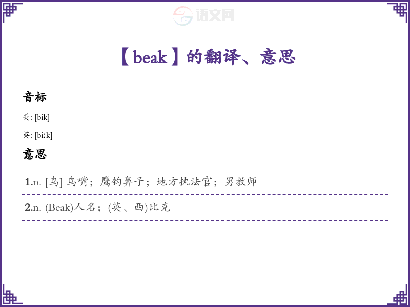 课本:在**的英语教材中,beak通常出现在初中或高中阶段的动物相关单元。在牛津和美国的教材中,通常在小学高年级或初中生物单元中提到这个词。