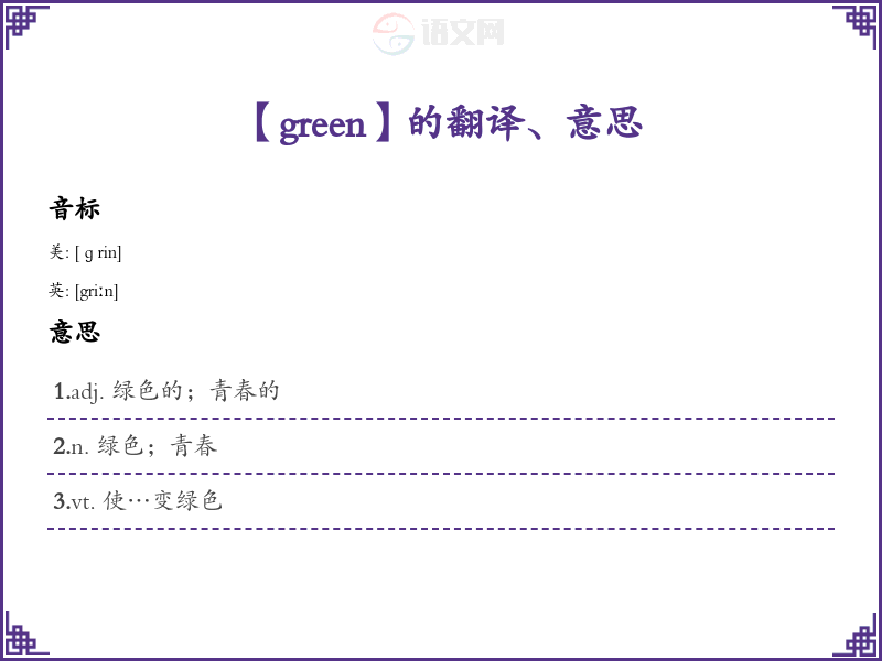 - 谐音联想记忆:将 "green" 读作“鬼林”,想象在幽暗的森林中,绿色植物生长茂盛的场景。