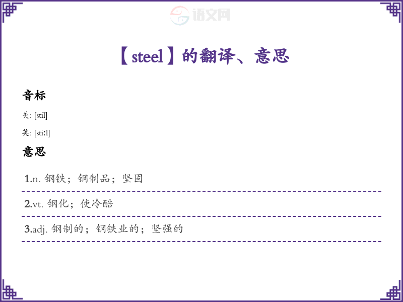 - 定义:Steel is a strong, hard metal made of iron and carbon, used for construction and various tools.