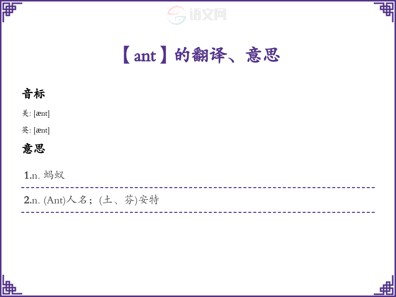 - 音标记忆法:将“ant”的发音与“aunt”相结合,想象一只蚂蚁在你姑姑的面前走来走去。