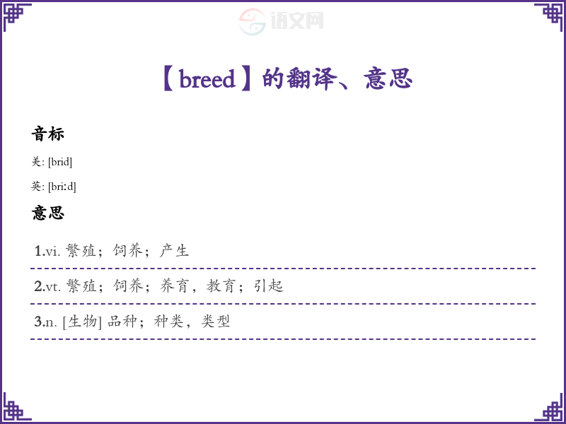 - 定义:作为动词,breed意指“使动物或植物繁殖”,也可以引申为“产生某种事物”;作为名词,breed指“某种动物或植物的品种”或“某一类人”。