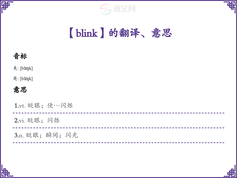 “Blink”发音为 /blɪŋk/。可以通过发音练*,将其与“link”或“think”等词进行对比,帮助记忆。 -