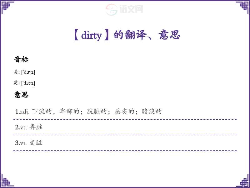 "Dirty" 是一个形容词,字面意思是“不干净的”或“肮脏的”,表示表面上有污垢、灰尘或其他不洁物质。 - 词性: