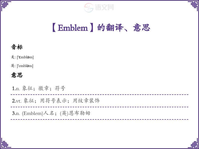 - 字面意思:Emblem 是指一种象征或标志,通常用于代表某一特定的理念、群体或国家。其定义为“一个象征性的标志或图案,通常用于表示某种理念或身份”。