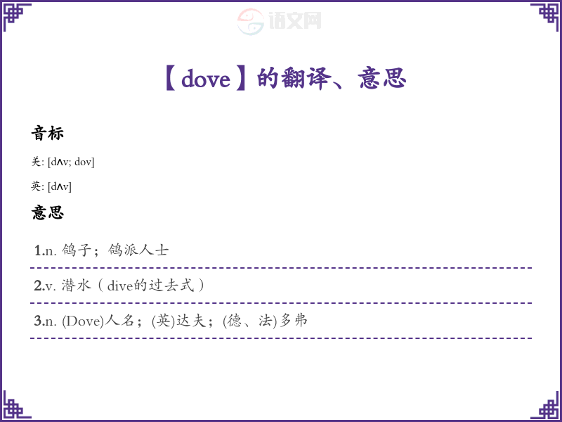 “Dove”可以指一种鸟类,通常是指鸽子,尤其是指家鸽。鸽子在许多文化中象征着和平与爱。 - 词性: