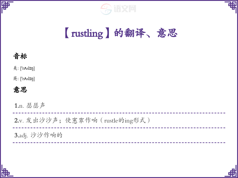 2. v. 发出沙沙声;使窸窣作响(rustle的ing形式)