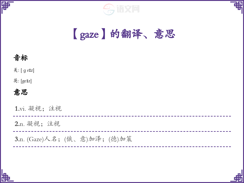 - 谐音联想记忆:可以联想“Gaze”与“盖子”(gai zi),想象一个盖子在凝视某物。