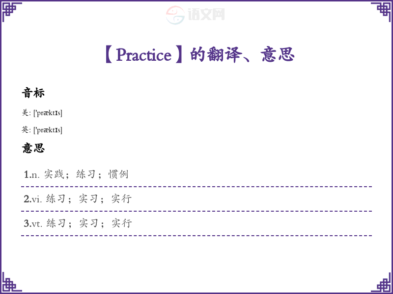 - 字面意思:Practice 的字面意思是“实践”或“练*”,指的是通过反复的活动或行为来提高技能或能力。