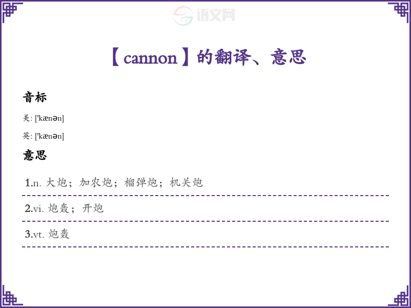 - 音标记忆法:cannon的音标为/ˈkænən/,可以通过分解音节来记忆,例如“can”(能)和“non”(非),联想为“能非”的声音,形象地记住其发音。