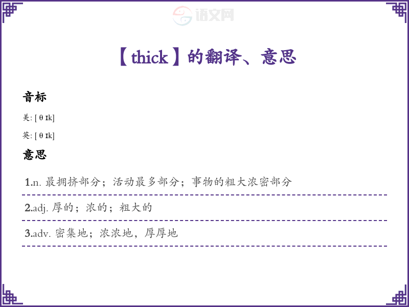 - 在牛津和美国的教材中,"thick" 也常用于小学及中学的阅读理解和词汇练*中。