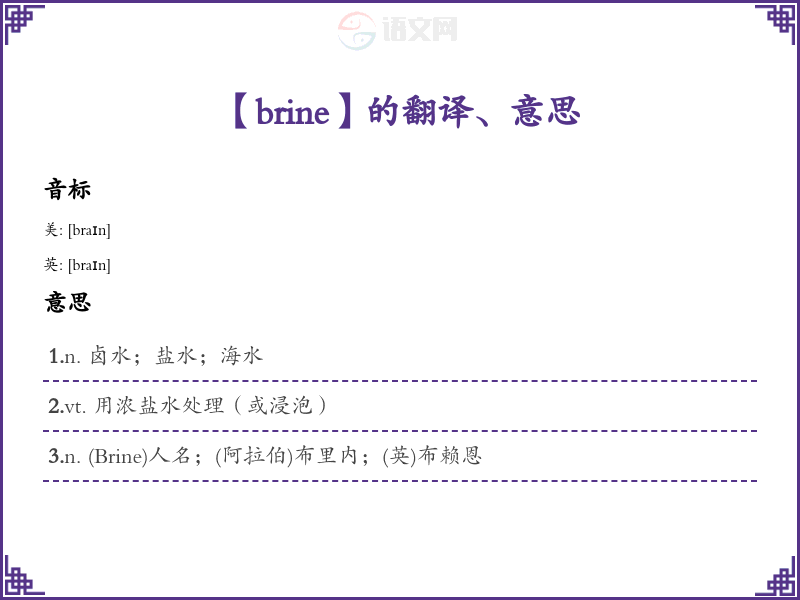 - 谐音联想记忆:可以联想到 “brine” 和 “brine” 相关的 “腌制” 过程,形成具体的画面。