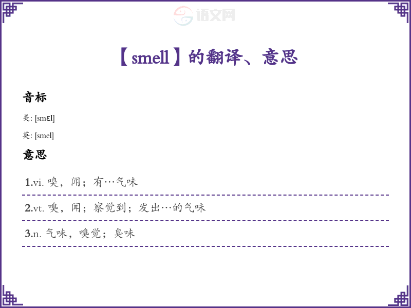 - 词性:名词和动词。作为名词时表示“气味”,作为动词时表示“闻到气味”。