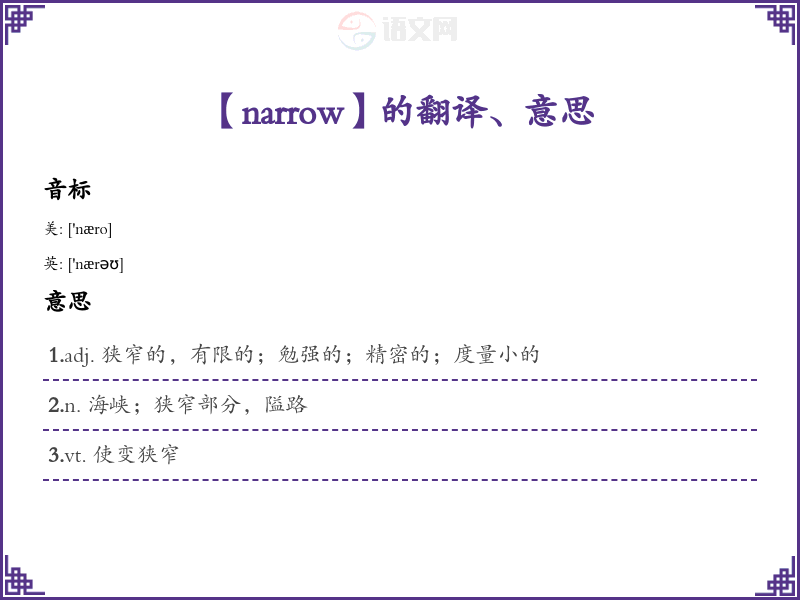 通过上述分析与学方法,可以帮助学者更好地理解和使用“narrow”这个单词。