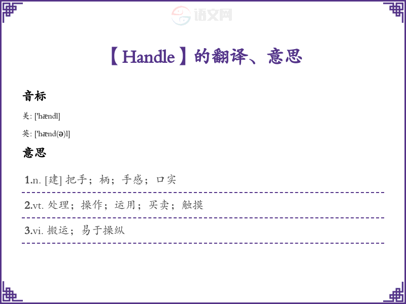 - 在牛津和美国的教材中,handle 可能在中学阶段的语法和词汇书中进行介绍。