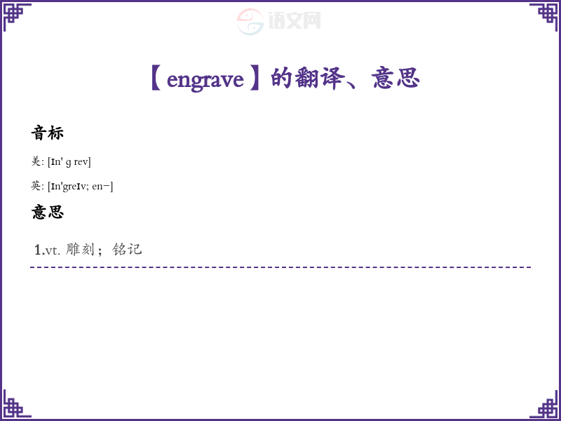 - 识别和记忆 "engrave" 的词根 "grave",联想到雕刻的动作。可以举例想象用刻刀在石头上进行雕刻的过程。