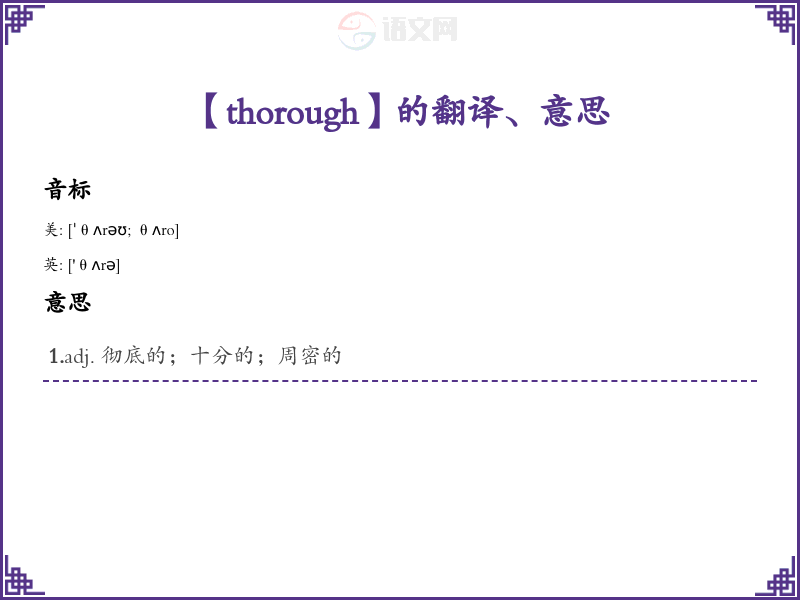 5、[[强调]] Thorough is used to emphasize the large degree or extent of something. (用于强调程度或范围) 完全的