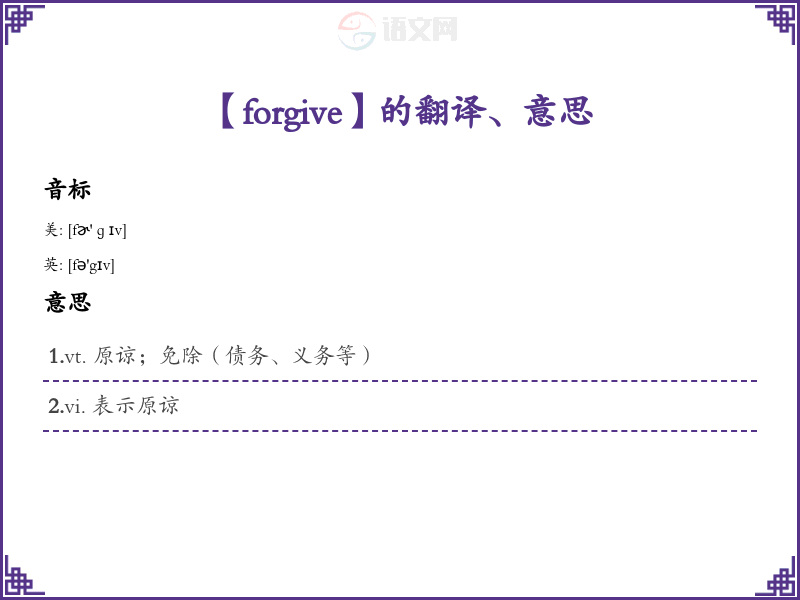 谐音联想记忆:可以将“forgive”联想为“for给”,即“为了给”,帮助记忆其原谅和宽恕的含义。