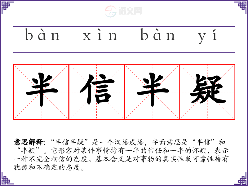 “半信半疑”是一个汉语成语,字面意思是“半信”和“半疑”。它形容对某件事情持有一半的信任和一半的怀疑,表示一种不完全相信的态度。基本含义是对事物的真实性或可靠性持有犹豫和不确定的态度。