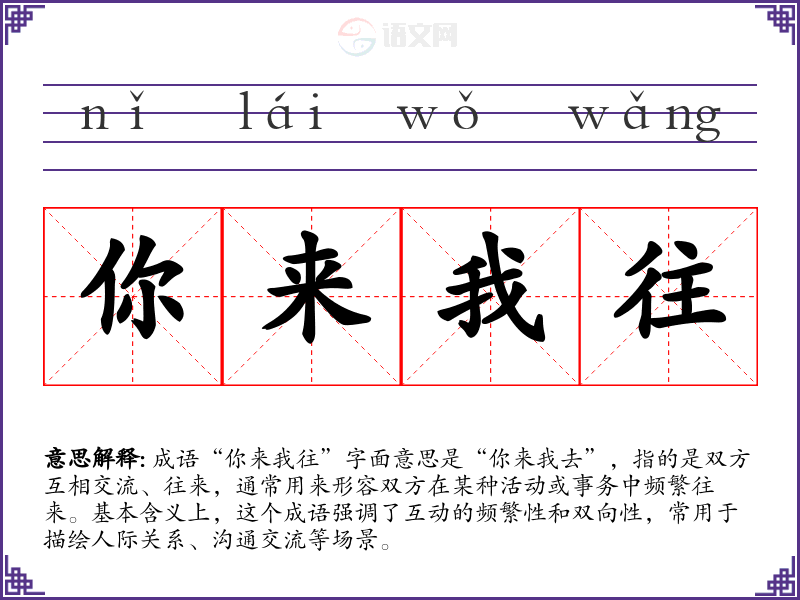 成语“你来我往”字面意思是“你来我去”,指的是双方互相交流、往来,通常用来形容双方在某种活动或事务中频繁往来。基本含义上,这个成语强调了互动的频繁性和双向性,常用于描绘人际关系、沟通交流等场景。