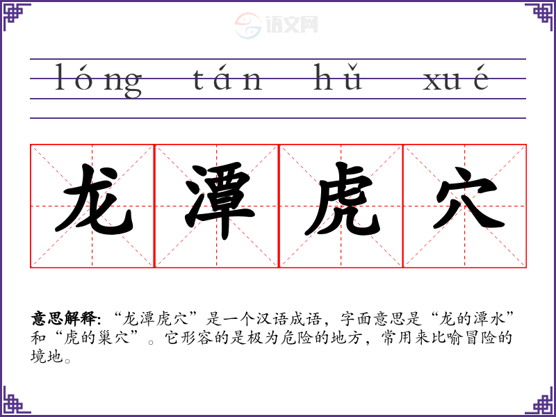 “龙潭虎穴”是一个汉语成语,字面意思是“龙的潭水”和“虎的巢穴”。它形容的是极为危险的地方,常用来比喻冒险的境地。