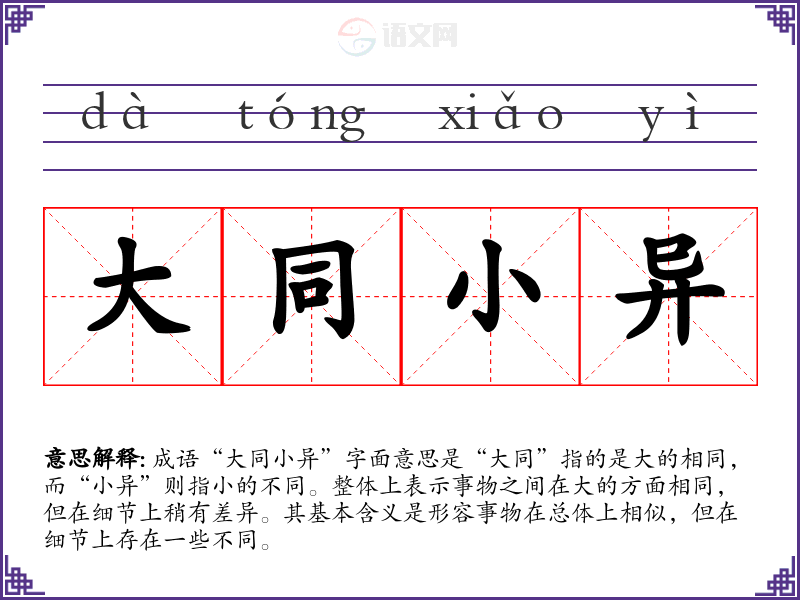 成语“大同小异”字面意思是“大同”指的是大的相同,而“小异”则指小的不同。整体上表示事物之间在大的方面相同,但在细节上稍有差异。其基本含义是形容事物在总体上相似,但在细节上存在一些不同。