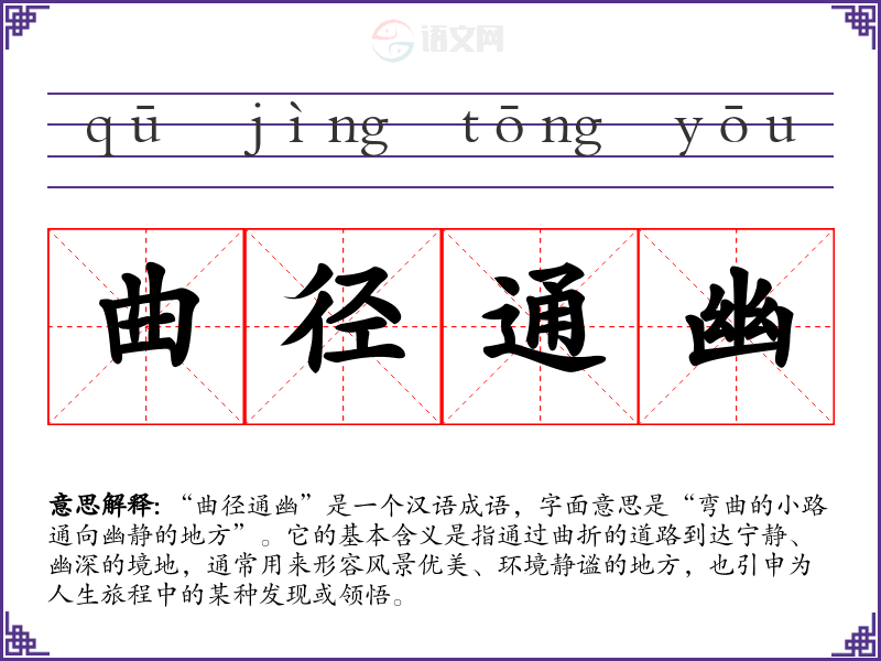 通过对“曲径通幽”的学,我认识到这个成语不仅仅是一个词汇,它承载着深厚的文化内涵和哲学思考。在语言学中,理解这样的成语能够帮助我更好地表达情感和思想,使我的表达更加丰富和生动。
