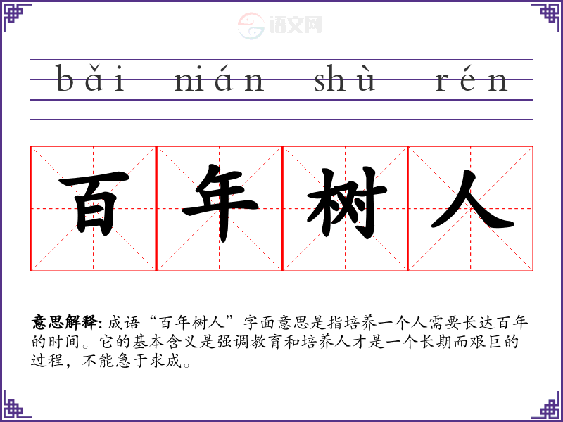 成语“百年树人”字面意思是指培养一个人需要长达百年的时间。它的基本含义是强调教育和培养人才是一个长期而艰巨的过程,不能急于求成。