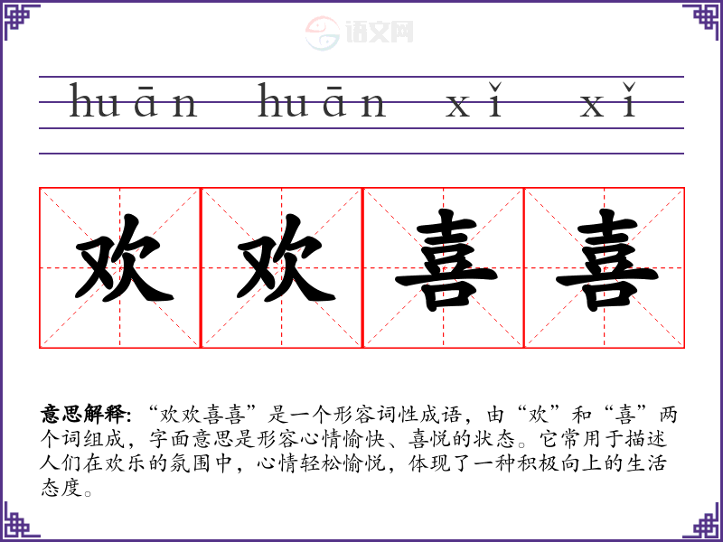 通过对“欢欢喜喜”这个成语的学,我深刻体会到语言中情感表达的重要性。它不仅仅是一个成语,而是承载着人们对生活的热爱和对美好时光的珍视。在语言学中,掌握这样的成语能够帮助我们更生动、更准确地表达情感和体验,让我们的交流更加丰富多彩。
